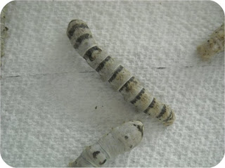 In other news, many of our silkworms have been busy molting. The period before and after each molt, when the silkworms are eating and growing, is called an instar. Silkworms go through a total of five instars in their life. When a silkworm is ready to molt, it stops eating and remains perfectly still, its head raised in the air, for at least a day or two. While they remain motionless, a new skin is forming underneath the old and when the new skin is fully developed, they begin to move and leave their old skin. According to Sylvia Johnson's book, often their first meal after the molt is the skin just shed, however few of ours have been doing this, preferring fresh food instead. This leaves us with bunches of dried-up old skin, attached to the sides of their box, ick. In the picture below, an old skin is shown on the left, while a molting worm is shown on the right: